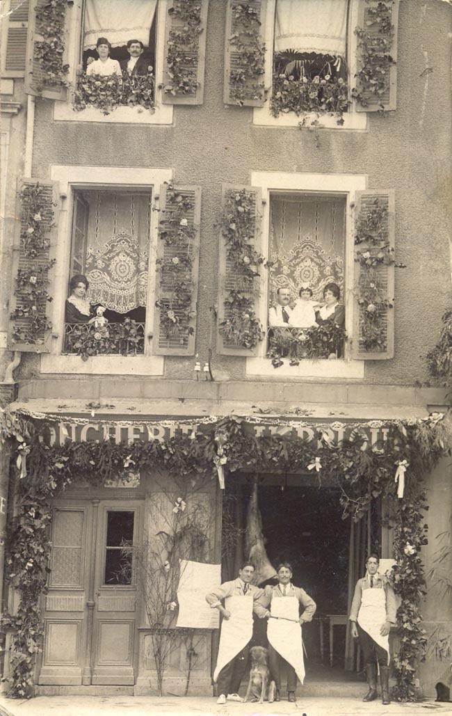A gauche Albert Antin et à côté de lui son frère Auguste. Ils ouvrent une boucherie,en 1919, rue du régiment de Bigorre. A droite Etienne Béamont.