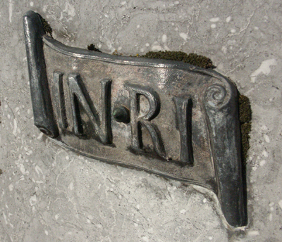 Le phylactère avec les initiales INRI est souvent placé en haut de la croix. Ces lettres rappellent l'expression ironique de Ponce Pilate : "Jésus de Nazareth, roi des Juifs".